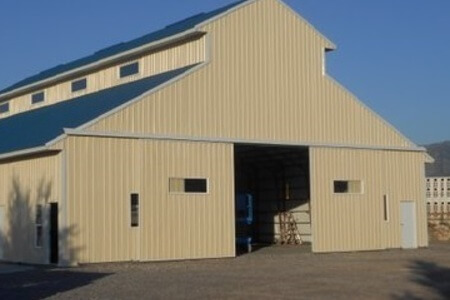 A “Gambrel” truss includes steel girders with steel columns available in straight leg and tapered leg versions. Widths available for straight leg version are 24’, 30’ and 40’ wide, with available eave heights of 8’ through 14’. Standard truss centers will be on 10’ centers. Second floor mezzanine is part of the package along with 18” eave extensions (overhangs). LEARN MORE.